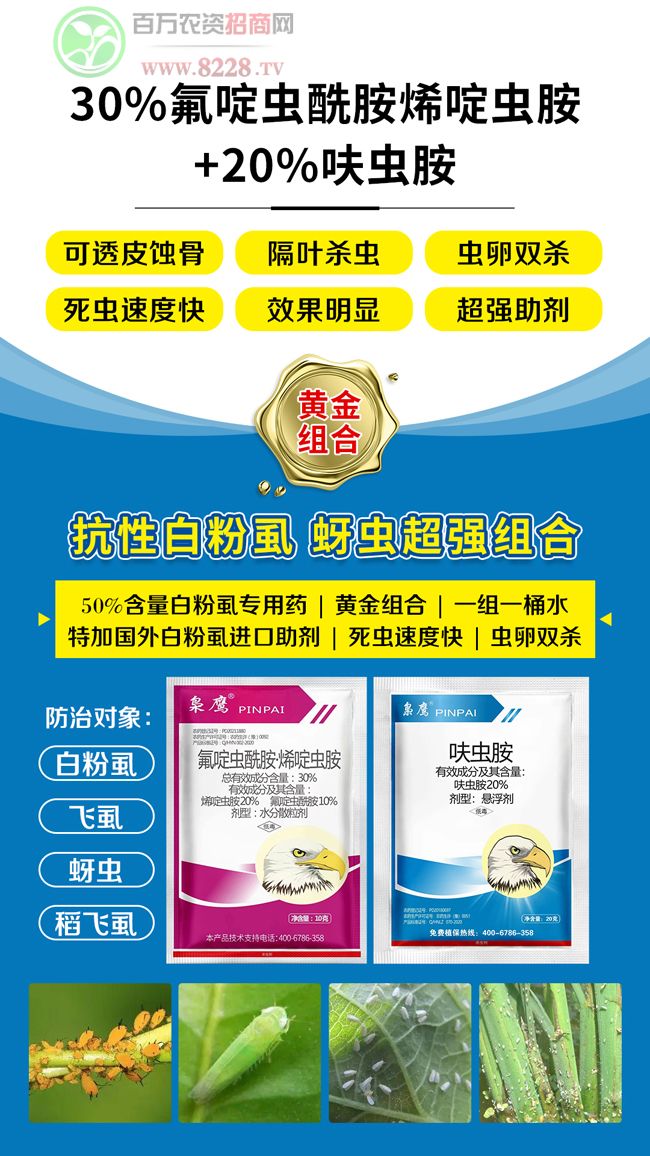 提起白粉虱,好多人都皺起了眉頭,都說難治,尤其到夏天白粉虱更加猖狂!有朋友問,那如果已經發生白粉虱蟲害怎么辦呢?不用害怕! ▼想要作物除干凈白粉虱!又快又準又狠!快用梟鷹30%氟啶蟲酰胺·烯啶蟲胺+20%呋蟲胺,粉虱死一地! 梟鷹30%氟啶蟲酰胺·烯啶蟲胺+20%呋蟲胺 專業的白粉虱蚜蟲防治套餐 ◎針對白粉虱,蚜蟲重災區研發 ◎殺蟲、殺卵、增產全靠它 ◎更長持效,更長效,更省力 效果好的產品才會有回頭客 效果好的產品大家才會一直都認可 梟鷹30%氟啶蟲酰胺·烯啶蟲胺+20%呋蟲胺 強力殺蟲殺卵 無論是經銷商還是種植戶 都紛紛直夸好! 梟鷹30%氟啶蟲酰胺·烯啶蟲胺+20%呋蟲胺 詳情聯系航地達農業竇總監:18749525516 |